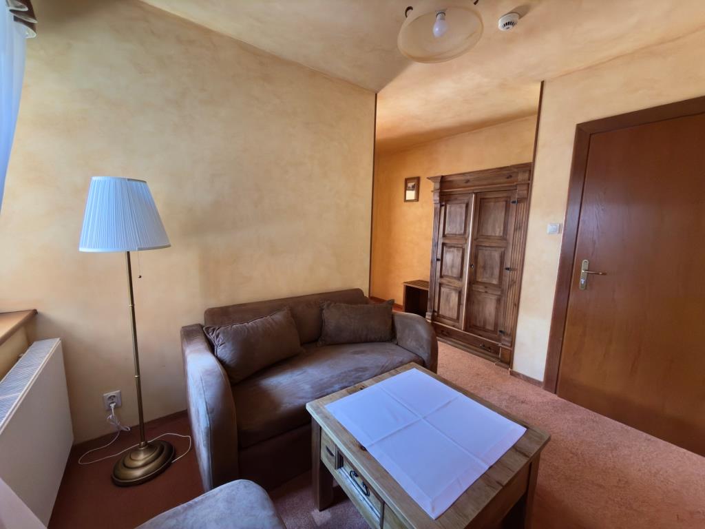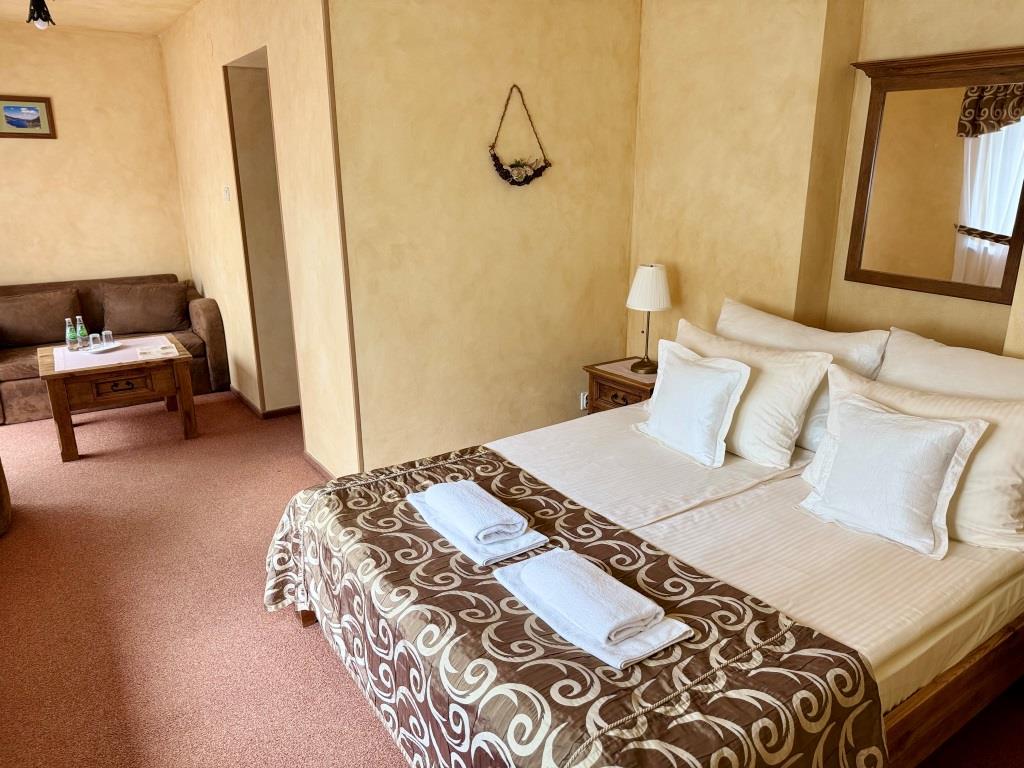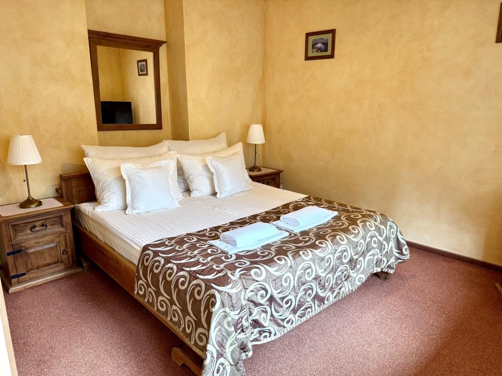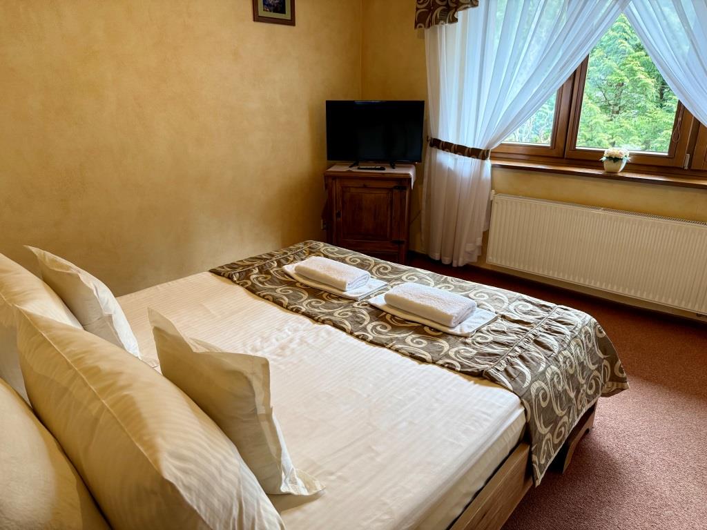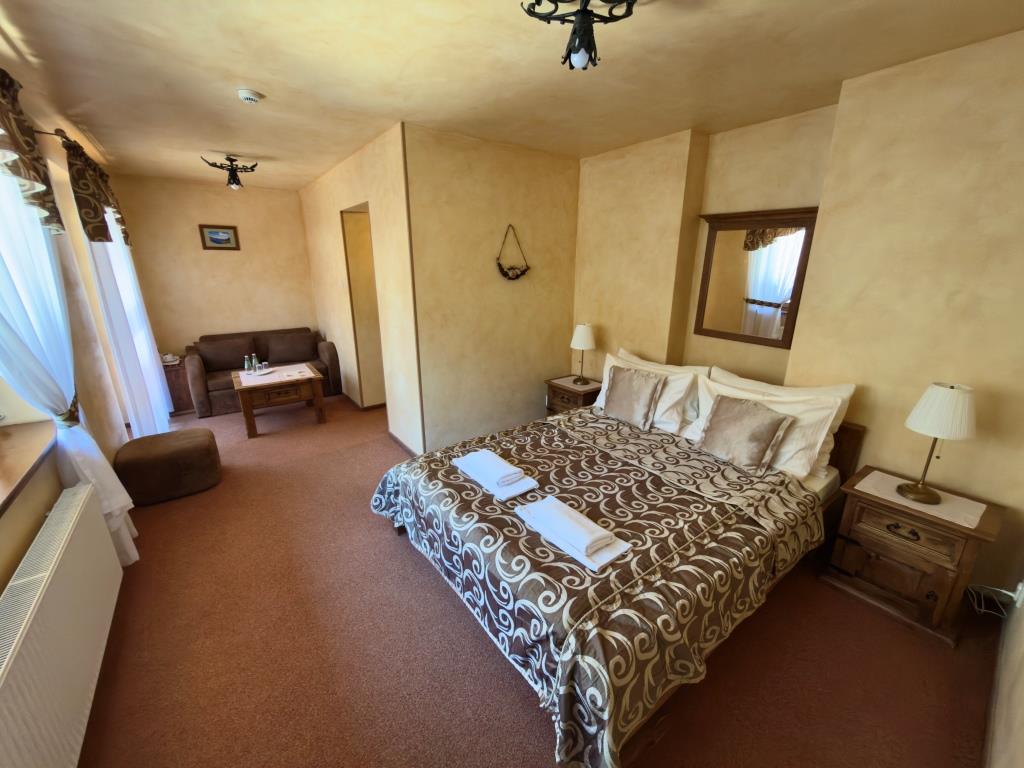 Jest to komfortowy, przestronny, jasny pokój, urządzony w klimacie stylu zakopiańskiego. Wyposażony w oryginalne meble z woskowanego litego drewna, wygodne łóżko małżeńskie oraz przyjemne miejsce do wypoczynku w postaci stolika kanapy lub foteli. Posiadamy również pokoje dwuosobowe De Lux z łóżkami pojedynczymi. W pokoju znajduje się łazienka. Widok z balkonu na lasy Tatrzańskiego Parku Narodowego.