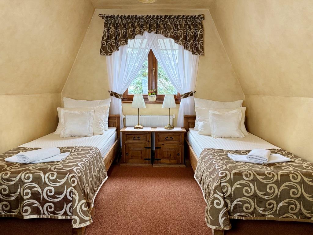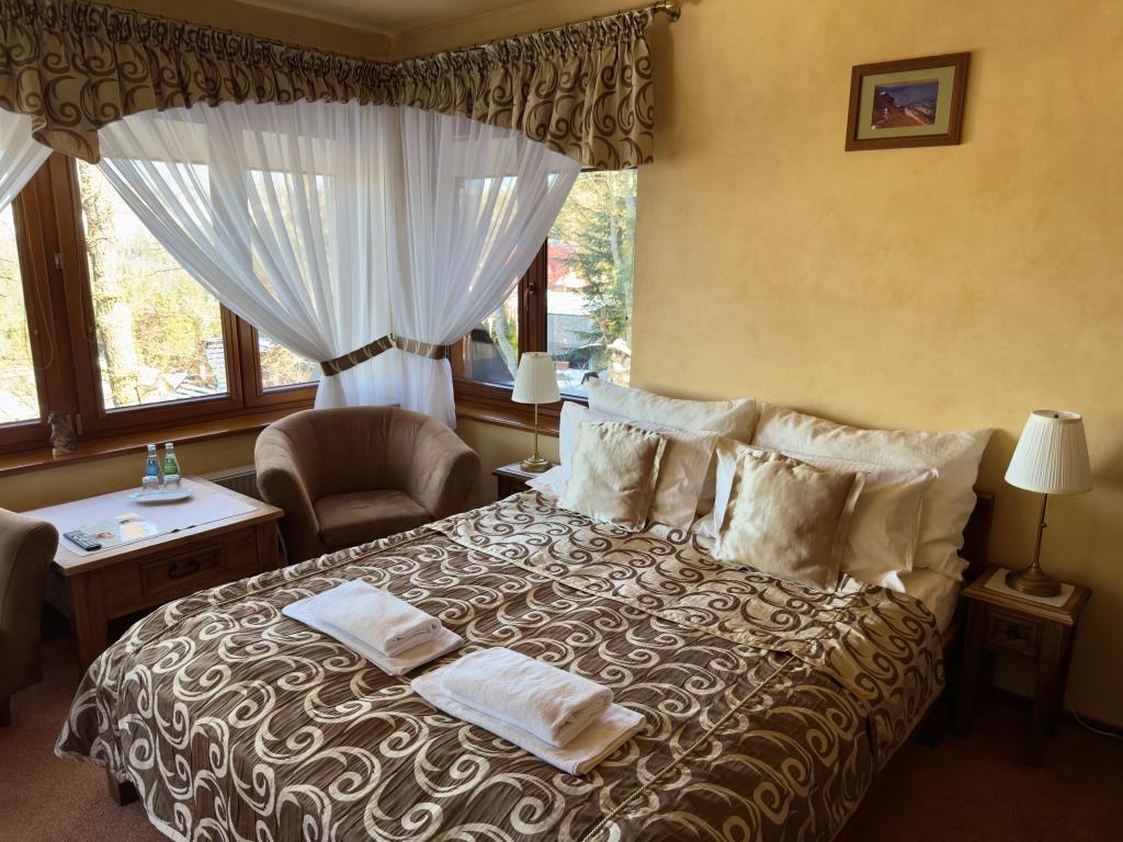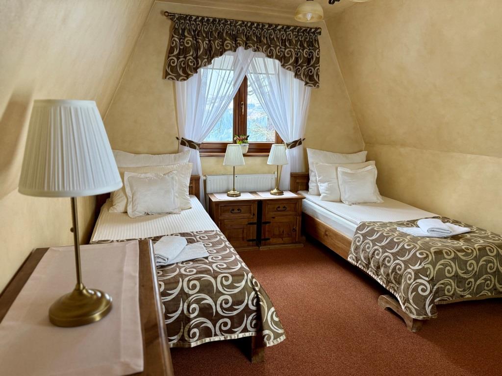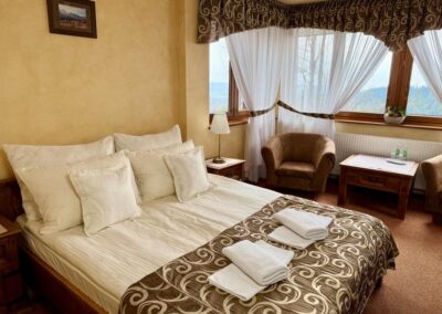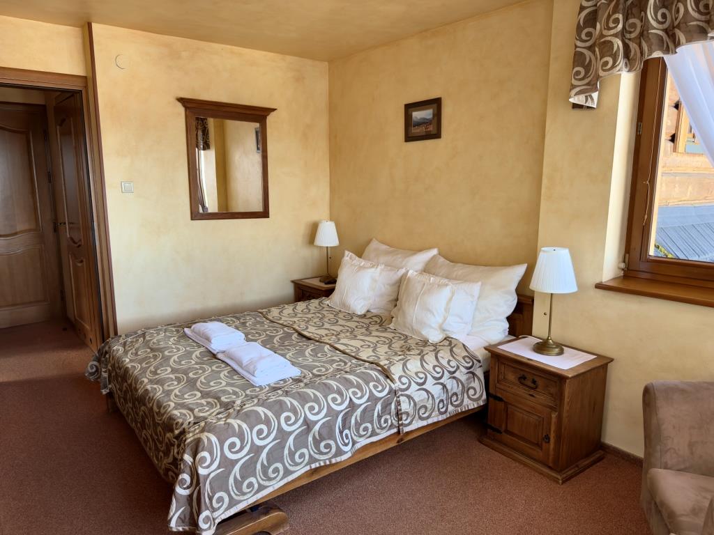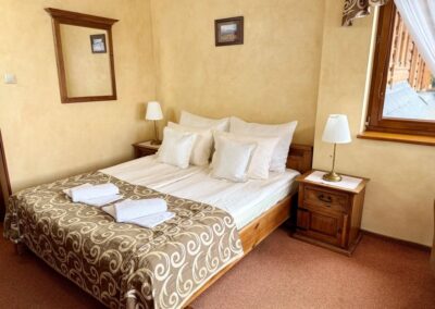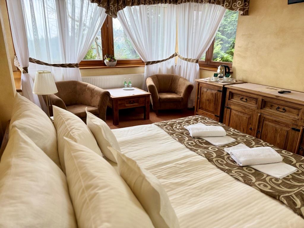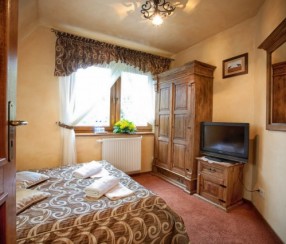 Studio posiada dwa osobne pokoje, urządzone w klimacie stylu zakopiańskiego i łazienkę z kabiną prysznicową. Rodzinne studia dwupokojowe wyposażone są w oryginalne meble z woskowanego litego drewna, w jednym z pokoi znajduje się wygodne łóżko małżeńskie natomiast w drugim dwa łóżka pojedyncze oraz stół i krzesła. znajduje się łazienka. Widok z okien przedstawia lasy Tatrzańskiego Parku Narodowego. Polecamy ten typ pokoju dla rodzin z dziećmi (dla dzieci do 10 lat przewidujemy zniżkę 30%).