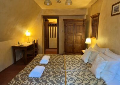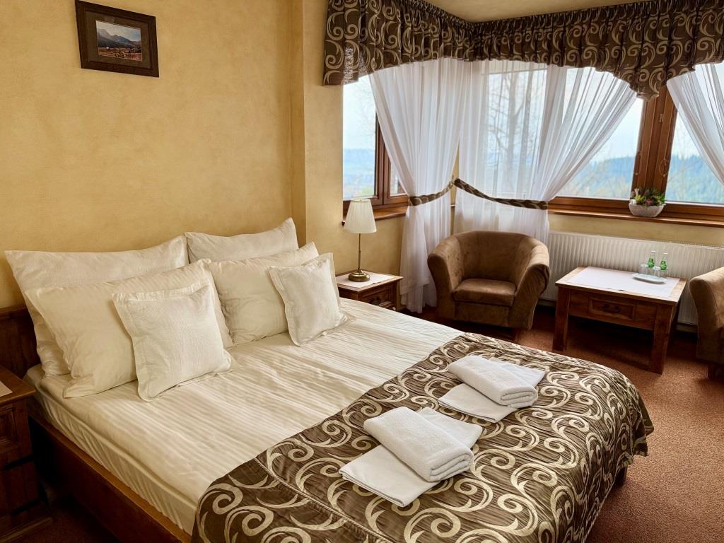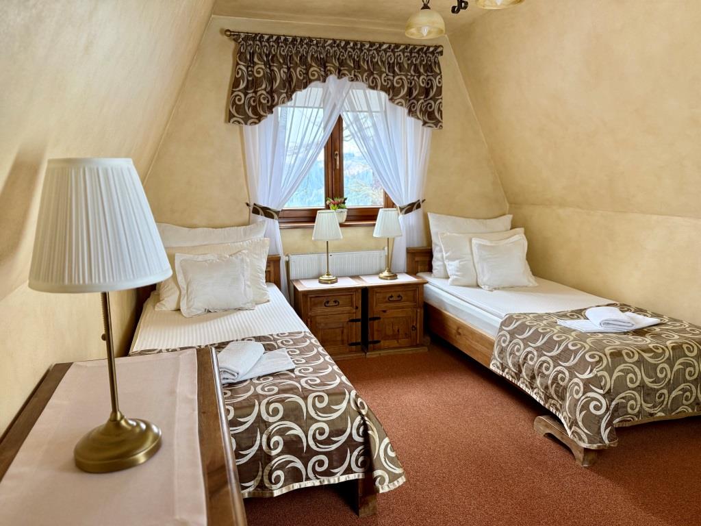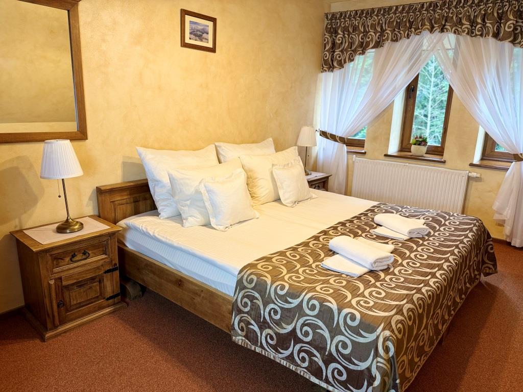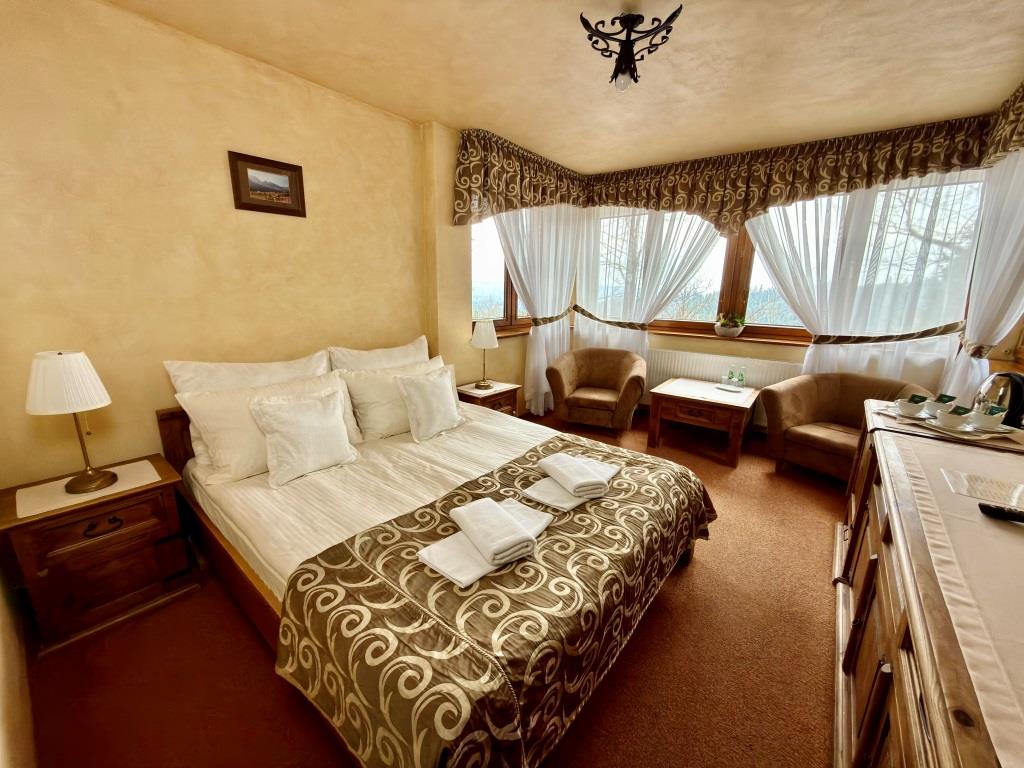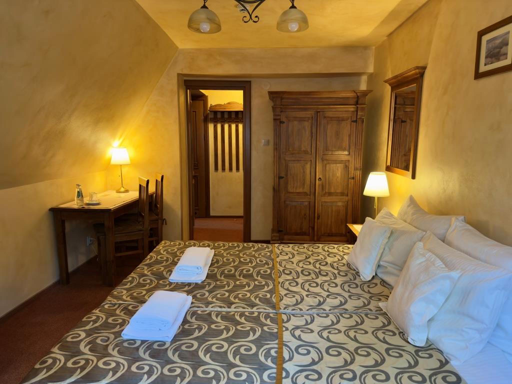Studio posiada dwa osobne pokoje, urządzone w klimacie stylu zakopiańskiego i łazienkę z kabiną prysznicową. Rodzinne studia dwupokojowe wyposażone są w oryginalne meble z woskowanego litego drewna, w jednym z pokoi znajduje się wygodne łóżko małżeńskie natomiast w drugim dwa łóżka pojedyncze oraz stół i krzesła. znajduje się łazienka. Widok z okien przedstawia lasy Tatrzańskiego Parku Narodowego. Polecamy ten typ pokoju dla rodzin z dziećmi (dla dzieci do 10 lat przewidujemy zniżkę 30%).